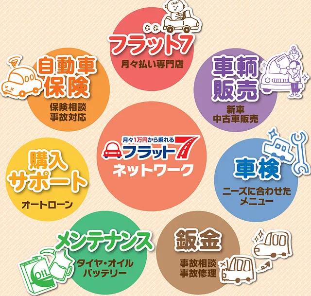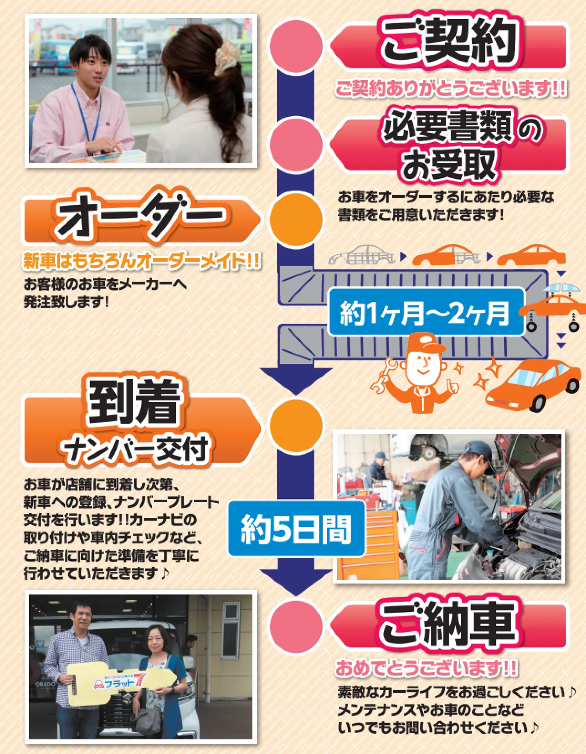 新車をご購入いただきましたお客様には、各メーカーの規定に基づいた保証修理をお約束いたします。また、フラット7あんしん保証もございますので、あわせてご利用いただけます。