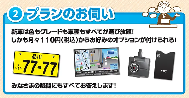 リース中は買った場合と同じように使用できます。希望ナンバーでも登録できます。