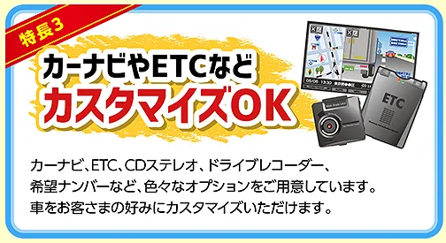 カーナビ、ETC、ドラレコ、バックカメラ、希望番号、コーティングなど色々なオプションをご用意しています。お客様の好みにカスタマイズいただけます。