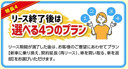 リース期間が満了した後は、お客様のご要望に合わせてプラン【新車に乗り換え】【再リース】【買取】【返却】をお選びいただけます。