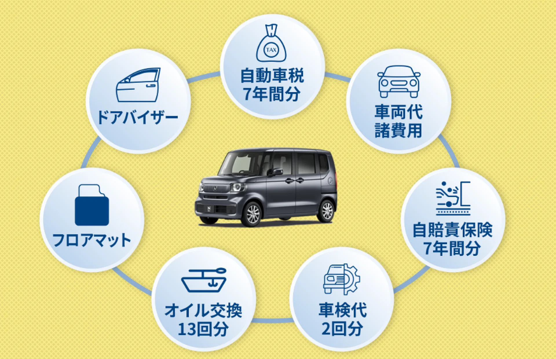 車両本体価格に加え、車検・税金・オイル交換・自賠責保険・フロアマット・ドアバイザーの料金が7年分すべてコミコミの料金設定!