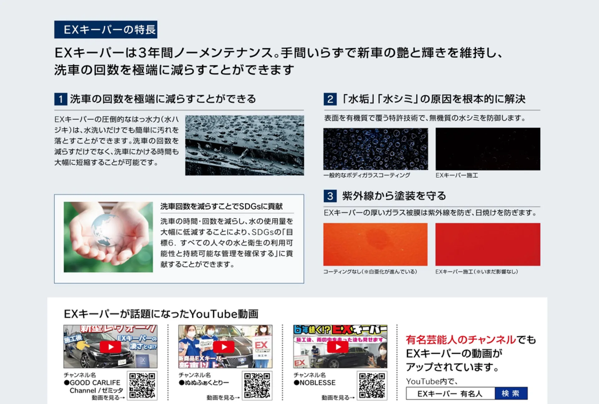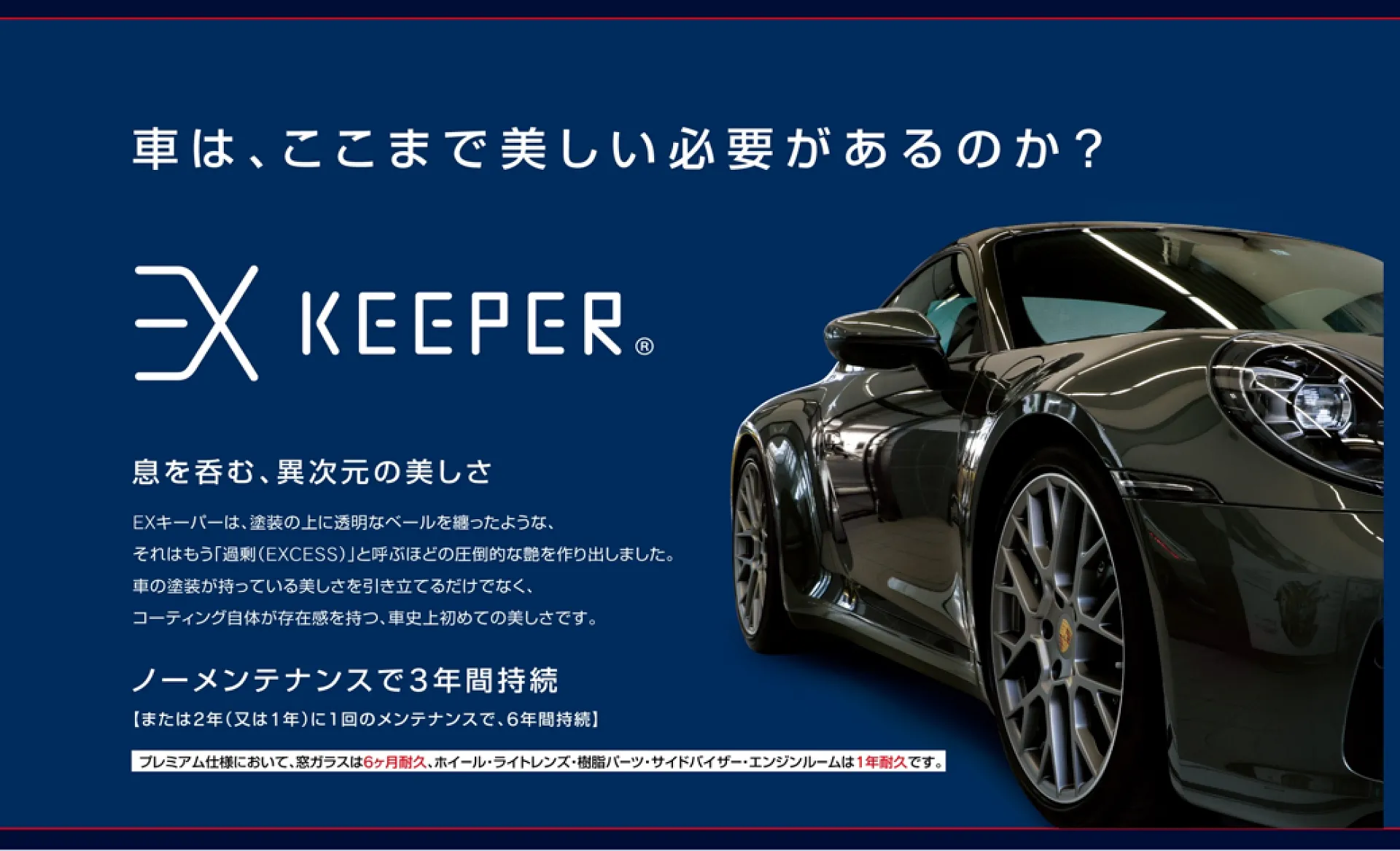新車を買ったので話題のEXキーパーをお願いしました。思った以上に満足です。次はコーティングメンテナンスもお願いする予定です。