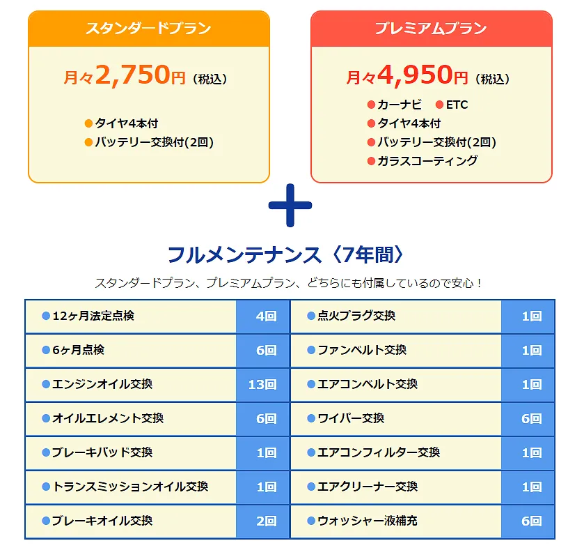 車検代・自動車税・自賠責保険料・オイル交換13回分・フロアマット&ドアバイザーが月々定額料金に含まれています。