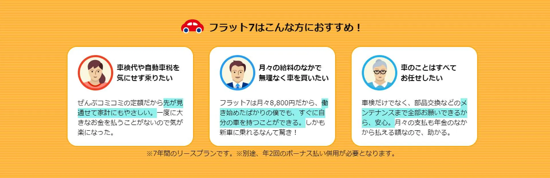 フラット7最大のメリットは「楽な家計のやりくり」「無理せずに新車が持てること」です。