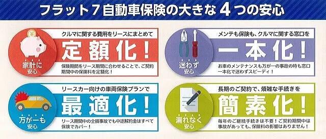 フラット7にてリース車両をご利用いただくお客様には、フラット7専用の自動車保険をおすすめします。