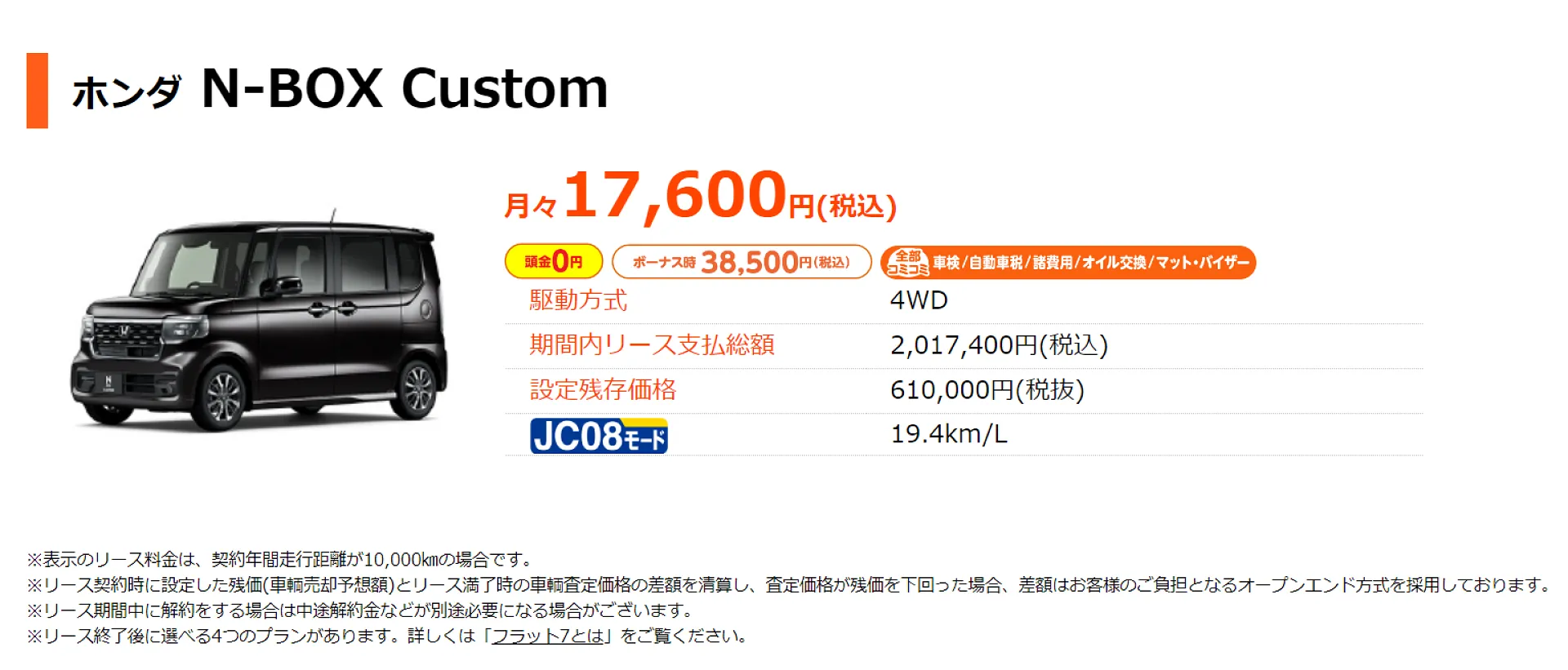 フラット7なら新型N-BOXカスタムが月々17,600円(税込)から乗れます。